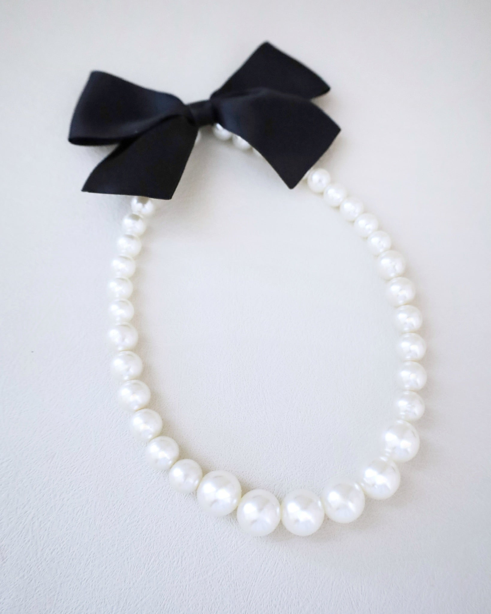 A classic pearl necklace with a dainty satin bow definitely to add an effortless romantic and classic look to your formal or casual style. Perfect to complete your date night, wedding, bridesmaids, holiday party, and any special occasions. This necklace is elastic and consists of assorted sizes of pearls. The bow can be styled sideways or at the back, or turn it around for another way to wear it.