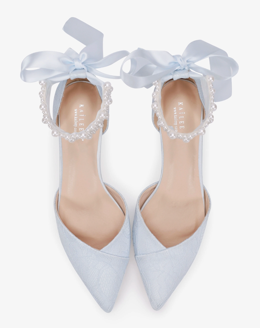 Step into bold elegance with these lace pointy toe low block heels. Designed to make a statement, their delicate lace and timeless silhouette fuse daring style with subtle luxury. The stunning pearl-embellished ankle strap tied with satin ribbon adds a graceful, bridal touch that catches the light with every step. These heels redefine sophistication with a touch of classic charm, making them perfect for brides, bridesmaids, weddings, proms, parties, or other special events where you want to stand out with confidence and grace. The light blue color can easily be your something blue.