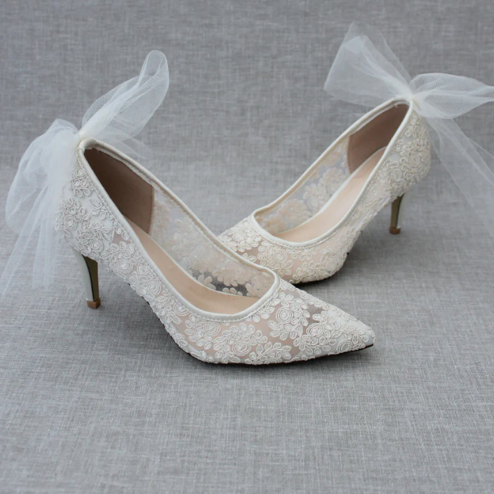 Crochet Lace Wedding Collection. Vintage inspired pointed toe crochet lace. The fluffy tulle bows detailing adds a fun and chic statement piece.